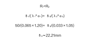 譬如原设计采用发泡水泥板,设计厚度δ1=50mm,材料导热系数λ1=0.065,修正系数α1=1.20。如想替换成石墨聚苯板,材料导热系数λ2=0.033,修正系数α2=1.05,则替换后的石墨聚苯板设计厚度δ2应为: